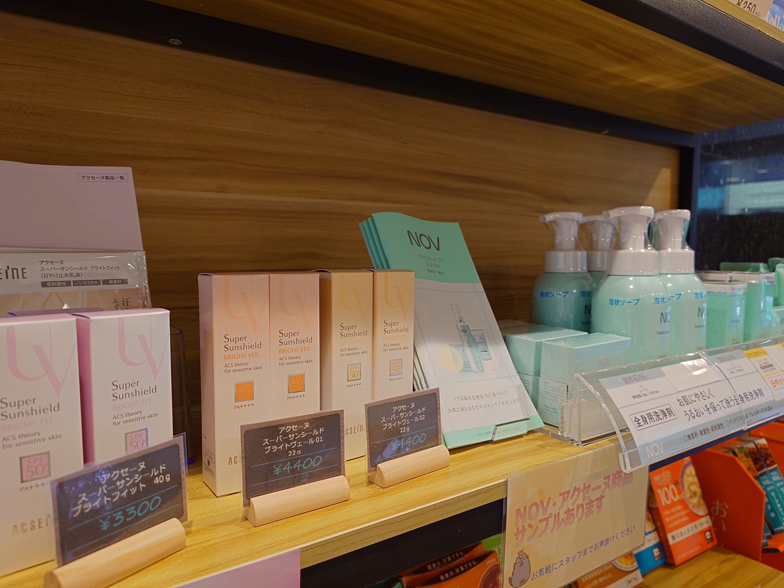 敏感肌や、ニキビの方におすすめのNOVシリーズや、デパートなどで取り扱いのあるアクセーヌの日焼け止めなど取り揃えております。