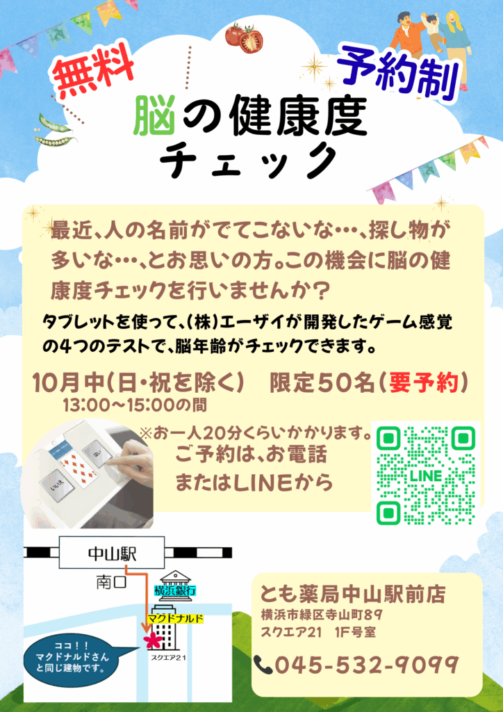 10月限定 脳の健康チェック 2025-10-03 | コメントはまだありません 10月限定で、無料で「脳の健康チェック」を行えます。タブレットを使って、株)エーザイが開発したゲーム感覚の4つのテストで、あなたの脳年齢をチェックすることができます。「予約制」ですので、ご希望の方は、電話かLINEからお申し込みください。 未分類